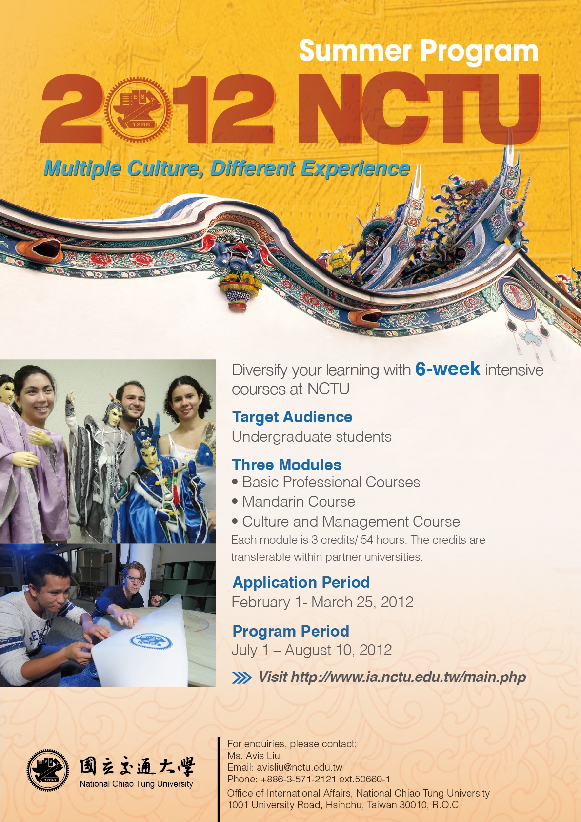 为加强两岸大学生文化交流,建立更广泛的两岸学生互动平台,新竹交通大学将于2012 年暑期提供六周的暑期交流项目(Summer School)。学院课程包括基本专业课程(电子和计算机工程、计算机科学、工程和科学);精心设计的普通话学习课程以及文化和企业管理课程三个模块(每个模块3学分54小时)。除此之外交流项目还包含文化之旅,探访台湾的风土民情,达成多元化与全方位的学习体验。