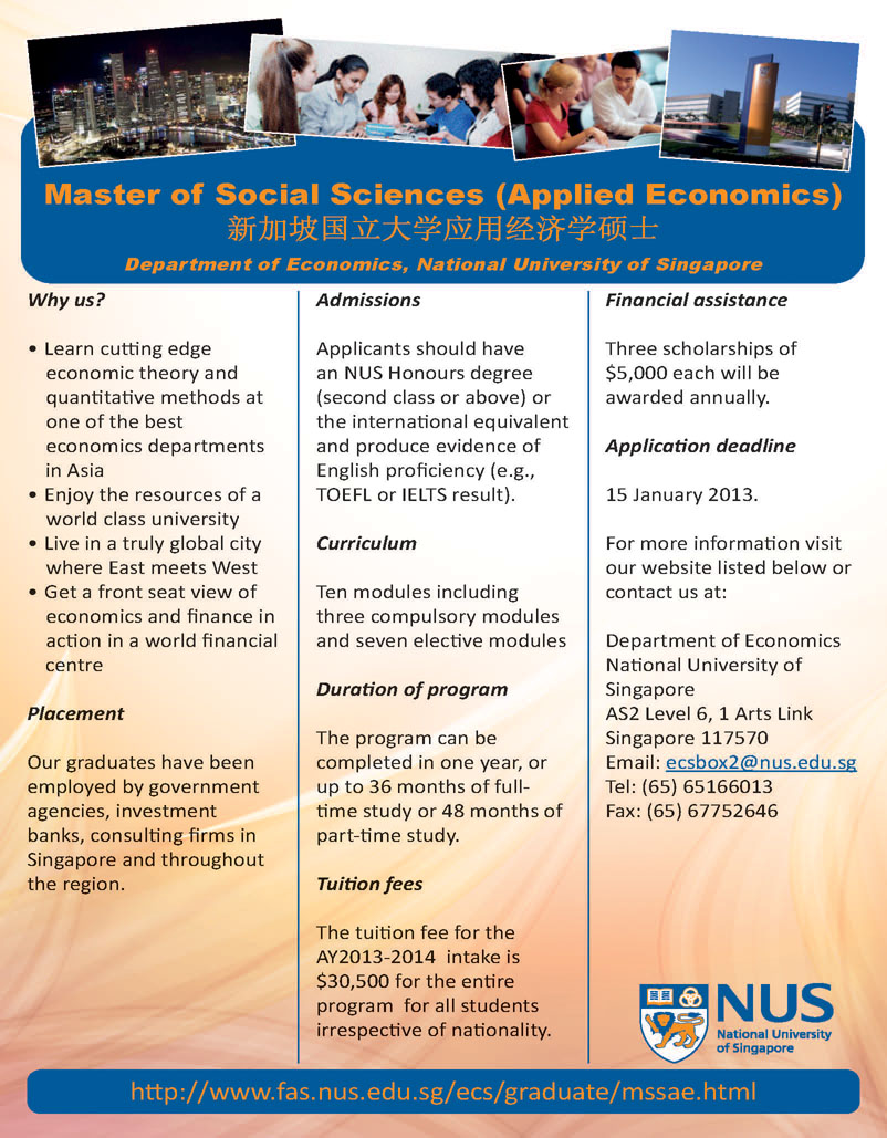 新加坡国立大学将于12月3日(星期一)下午3点50分在西溪校区田家炳书院516教室举办新加坡国立大学应用经济学硕士项目的招生及未来就业情况的推介会,请有兴趣的同学积极参加。