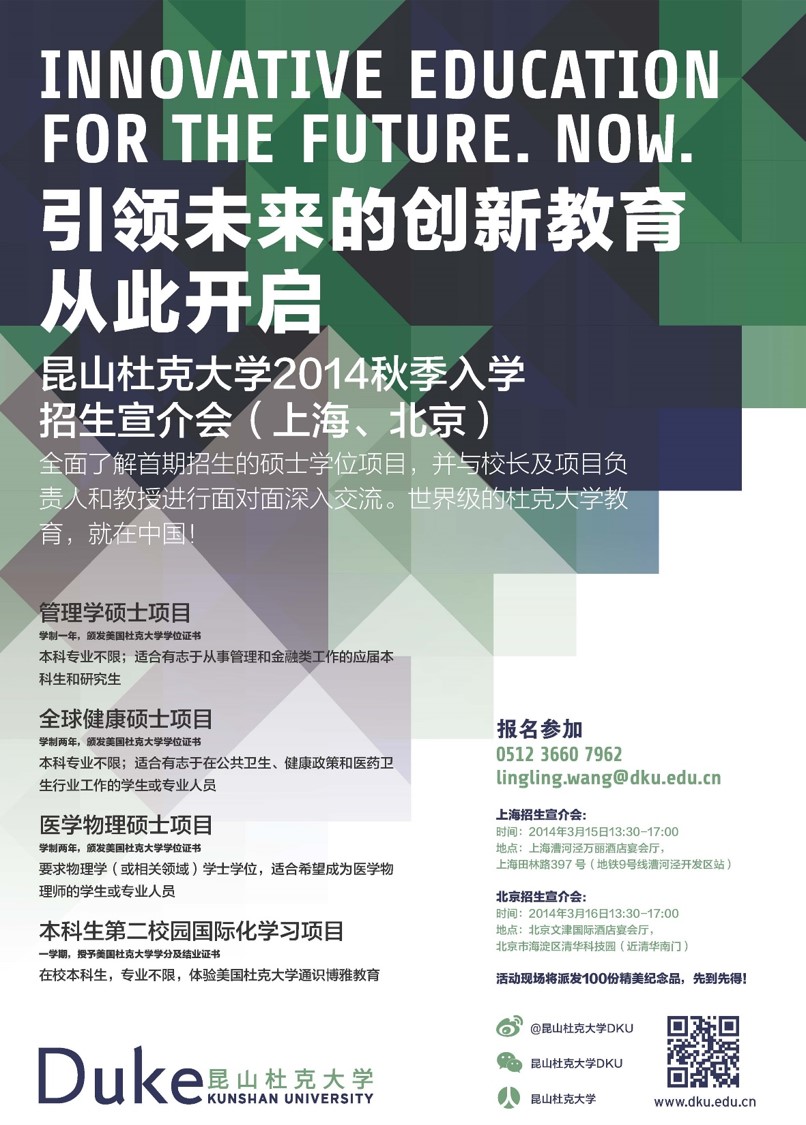 昆山杜克大学将于3月15日下午在上海召开2014年秋季入学研究生招生宣介会,欢迎有兴趣的同学参加,详细内容请见附件。