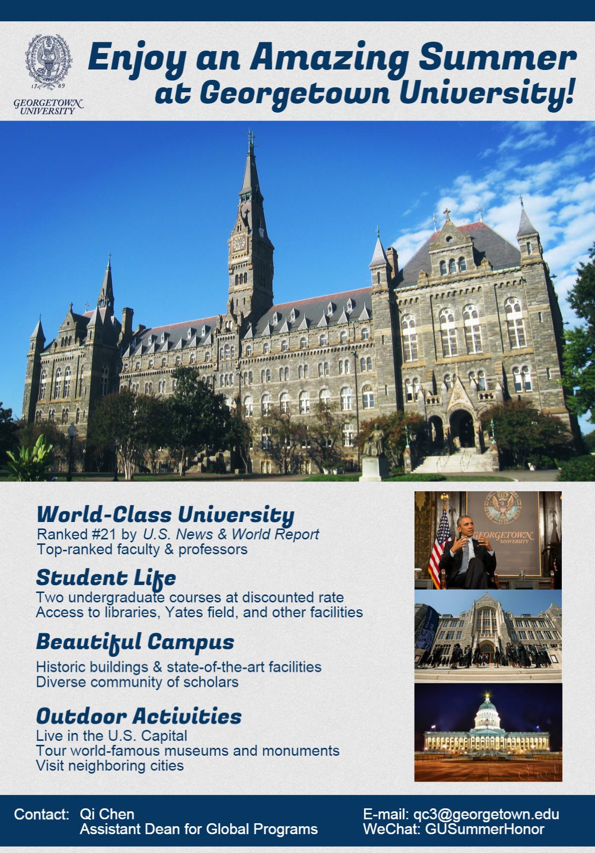 经与美国乔治城大学(Georgetown University)的约定,我校今年暑期将继续选派本科生赴乔治城大学参加暑期课程学习项目。具体通知如下: